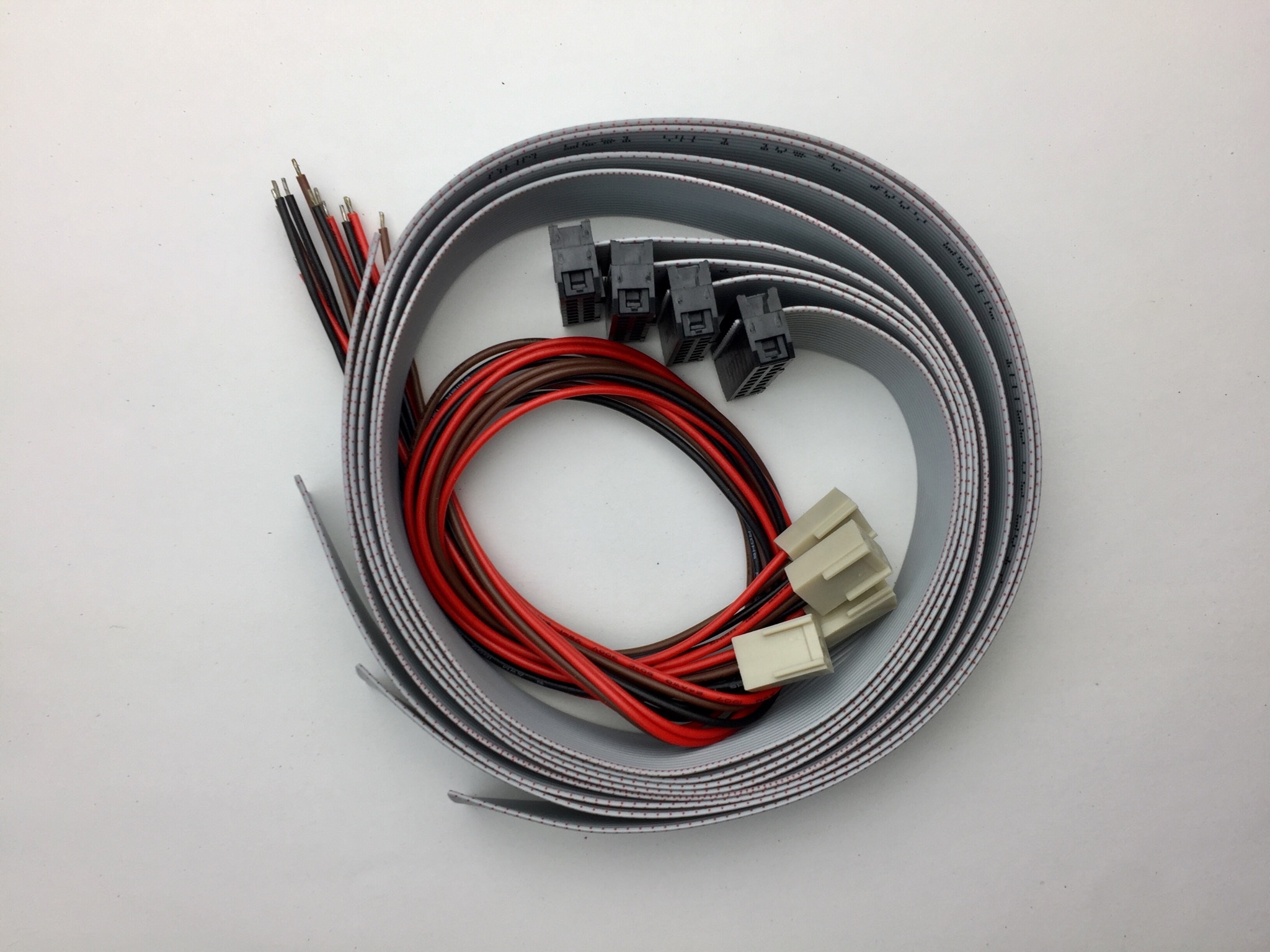 Kabelsatz zum Doepfer CTM64 Bestehtend aus vier Flachbandkabeln zu je 50cm mit aufgepresstem 16-poligem Pfostenverbinder an einem Ende und vier 3-poligen Pfostenverbindern mit Verpolungsschutz und 3-adrigem Kabel (ca. je 30 cm).