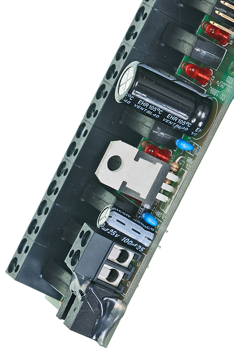 - zusätzliche 2-polige Schraubklemme, um mehrere Relais-Platinen mit nur einem Netzteil betreiben zu können (falls keine galvanische Trennung erforderlich ist, kann hier auch die CTM64-Basisplatine angeschlossen werden, so dass für den gesamten Aufbau nur ein Netzteil erforderlich ist)