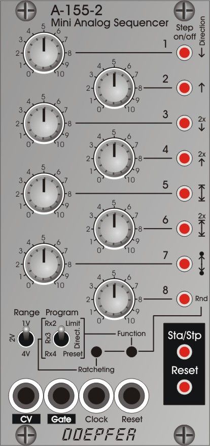 Module A-155-2 is a small, very compact designed analog sequencer with a lot of features. The sequence length is 8 steps. Each step has available a control for the adjustment of the control voltage for this step and an illuminated momentary switch (button). The buttons are used in the standard running mode to turn on/off the gate of the step in question (button illuminated = gate on, not illuminated = gate off). In combination with other controls at the bottom of the front panel the buttons are used for additional functions: depending on the position of the Program toggle switch the button Function is used to program the length of the sequence (switch position Limit), the running direction (switch position Direct.) or to call up the preset management (switch position Preset) .